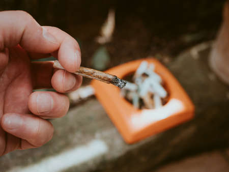 Man lighting up a joint a marihuana or hashish joint cigarette. Closeup detail view. Young people smoke cannabis thc grass. Real life scene concept