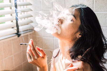 Holding and smoking a marijuana weed joint, inhaling smoke, and blowing it out. Medical Cannabis.