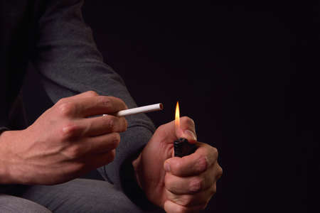 Close up of a teenager hands holding a cigarette and o lighter, ready to light it. Studio photo. Harmful smoking concept. Unhealthy habits.