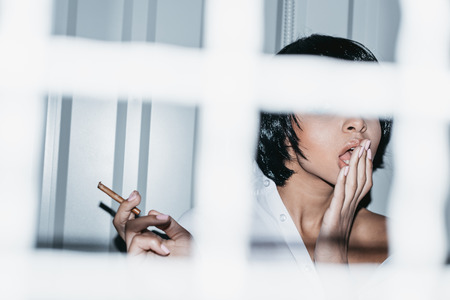 woman holding cigarette in hand behind grate