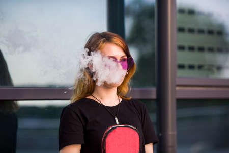 Vape teenager. Young pretty white caucasian girl in purple glasses on her head an electronic cigarette on the street in the summer. Deadly bad habit.
