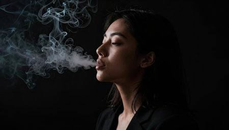 A woman is captured in a low-key portrait, exhaling smoke that swirls around her face, creating a dramatic and mysterious atmosphere against a dark background.