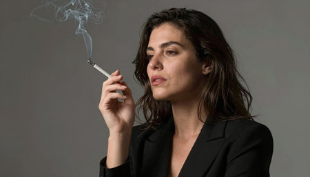 A sophisticated woman in a black blazer exudes confidence as she smokes a cigarette, with smoke swirling around her face against a neutral background.