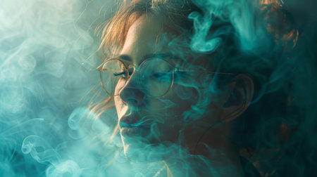 A woman with glasses and smoke in her face, AI