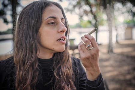 The cigarette in woman hand.
