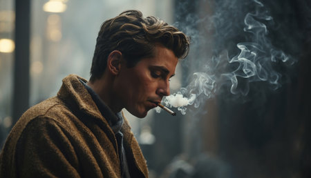 Young man in close up smoking cigarette, highlighting health hazards and repercussions