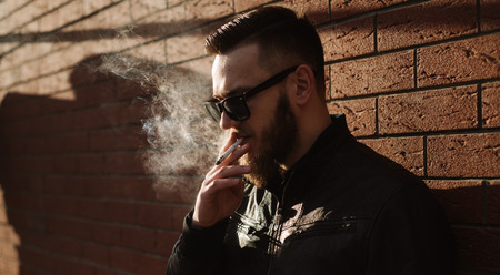 Side view of handsome bearded man smoking a cigarette over brick wall