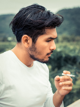 Young man smoking cigarette in the outdoors and nature background.