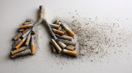 Abstract formation of lungs created with cigarette butts and ash conveys the destructive effects of smoking on respiratory health and well-being.