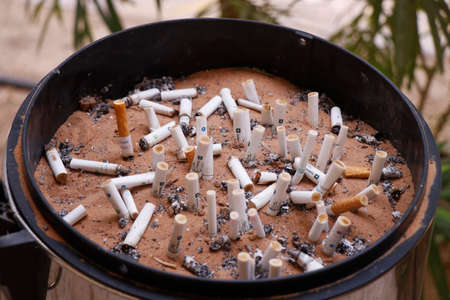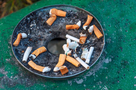 The dirty ashtray is full of cigarettes butt and ashes. Real life scene