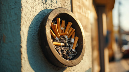An outdoor ashtray mounted on a wall, containing cigarette butts and ash under bright sunlight