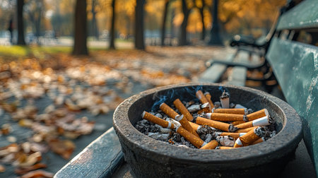 A cigarette butt extinguished in a public ashtray near a park trail, leaves scattered around