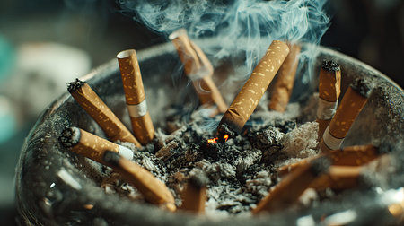 Close-up of cigarette butt extinguished in ashtray with smoke and ash. Concept of quit smoking. Nicotine addiction in smokers