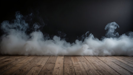 Dramatic dark toned foggy background. Foggy dark room with wooden floor. Selective focus