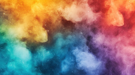 This captivating image showcases a vibrant explosion of colorful smoke in a stunning rainbow gradient, set against a dark background filled with stars, inspiring creativity and imagination.