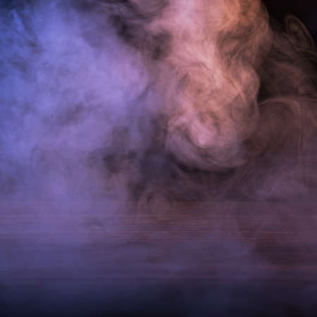 Conceptual image of multi-colored smoke isolated on dark black background and wooden table.
