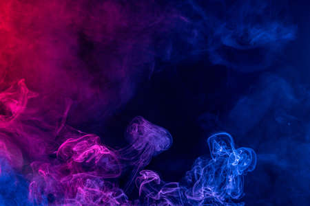Color smoke. Vapor cloud. Esoteric energy. Neon pink blue glowing gas mist mix texture on dark black copy space abstract background.