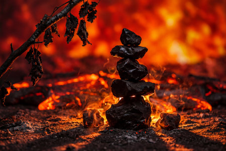 This image features burning charcoal with glowing embers. The composition showcases the dynamic interaction between fire and the dark environment. The contrasting colors, textures, and lighting create a dramatic visual. It is suitable for commercial uses related to energy, fuel, or abstract concepts.