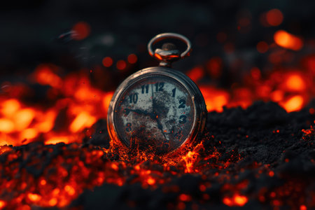 An alarm clock sits in the midst of a blazing fire, showing the juxtaposition of time and destruction. AI Generative