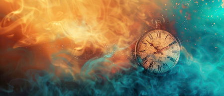 A vintage pocket watch with Roman numerals floats in a swirling mist of orange and blue smoke. The watch face is weathered and worn, suggesting a passage of time.