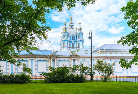 Beautiful view of Smolny Cathedral surrounded with green trees, Saint Petersburg.
