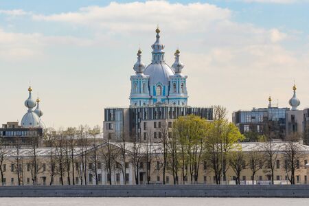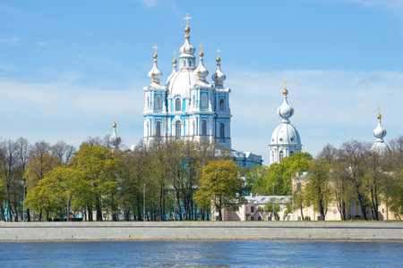 View of the Smolny Cathedral from the Neva river on a May sunny day. Saint-Petersburg, Russia