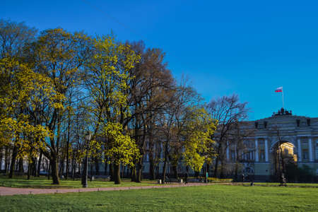 ST. PETERSBURG, RUSSIA - MAY 7, 2018: Smolnogo Garden (Sad-Parter Smolnogo) with the Smolny Convent of the Resurrection (or Smolny Cathedral) in the background.