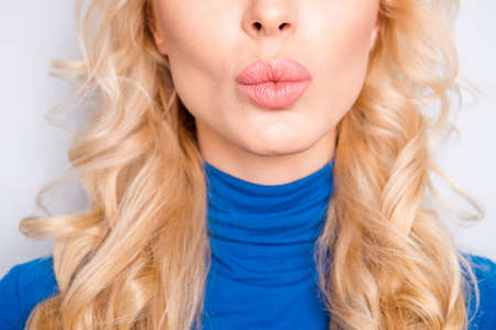 Cropped, close up, half face portrait of pretty, trendy, charming, lovely, nice, sexy, cute, blonde woman in blue roll neck isolated on grey background sending air kiss with pout lips to the camera