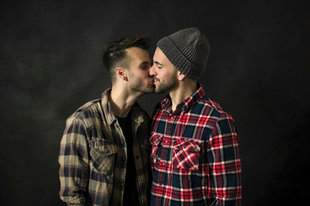 portrait of beautiful happy cheerful gay couple kissing on dark background