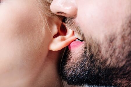 close up view of man biting ear of young woman