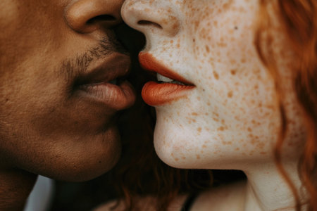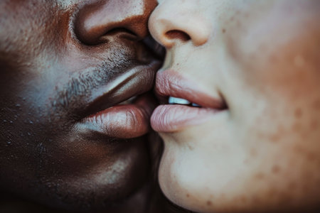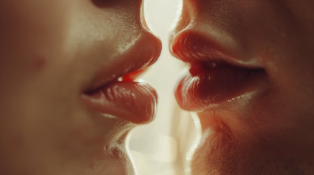 A close-up of a couple's lips barely touching in a kiss, with focus on the intimacy and the texture and tones of their skin
