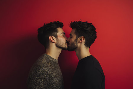 Two young men kissing against red backdrop. Concept of love, pride, diversity and lgbt relationships