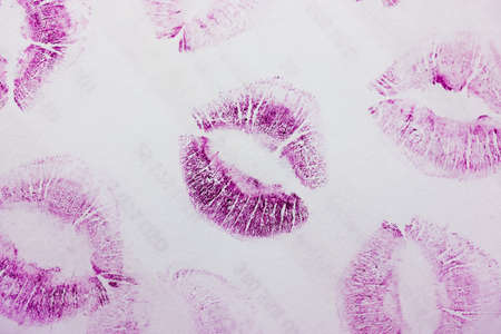 Abstract purple kisses isolated on white background. Lots of female lip prints on paper. Beautiful neon lips stamps. Valentine's day, romantic mood and love concept. Lipstick kisses. Print of lips