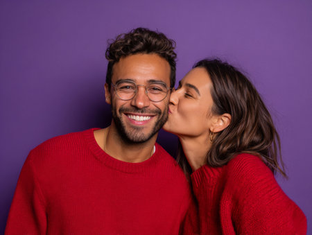 A charming image capturing a couple sharing an affectionate moment against a vibrant purple backdrop. The man, wearing a red sweater, smiles contentedly as the woman, dressed in a matching hue, plants a playful kiss on his cheek. This joyful scene radiates warmth and connection, perfect for romantic-themed content.