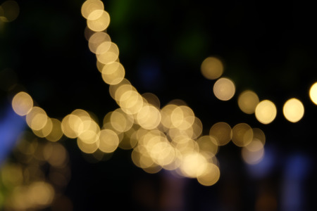 Beautiful Line of Outdoor Holidays Festival market lighting with bokeh at night. Abstract line of LED light bokeh defocused background