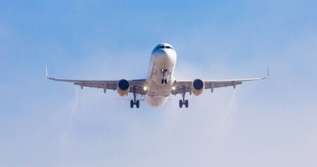 Modern airplane in the sky near Airport. takes off or landing.