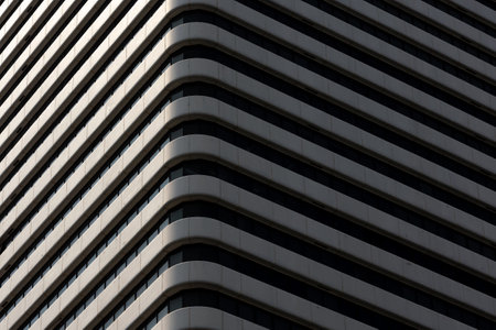 An abstract view of a modern skyscraper with repeating patterns of windows and balconies, showing the architectural design.
