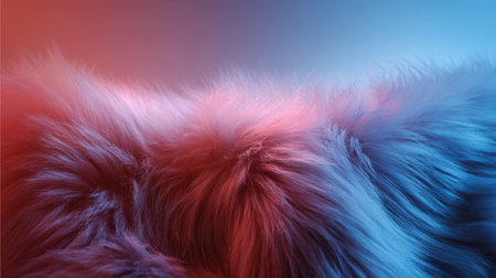 Close up of fluffy fur in red and blue tones creates a warm, tactile abstract texture suitable for fashion, beauty, or design projects. Generated A.I.