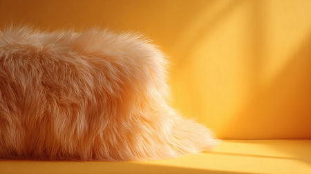 Cozy plush pillow with fluffy fur sits against a warm orange backdrop, creating inviting home decor. Soft light enhances texture and comfort, giving a welcoming, relaxed atmosphere. Generated A.I.