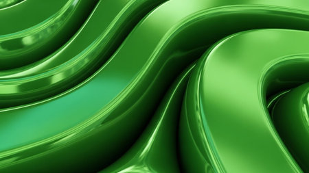 Vibrant, shiny green abstract ribbons with smooth, flowing curves and highly reflective surfaces create a dynamic...