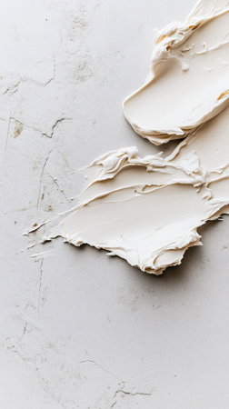 A close-up view of smooth, creamy white texture spread on a cracked, rough surface, resembling skincare or beauty product application, creating a minimalist and abstract visual.