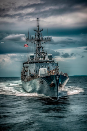 Powerful navy ship sailing ocean under dramatic clouds, demonstrating naval power and maritime security