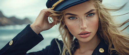 Blonde woman in navy cap gazes intensely on windy seaside, cinematic. AI-generated.