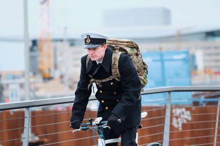 Copenhagen, Denmark 12 October 2017. Naval officer with a backpack riding a bicycle. People in Copenhagen, Denmark Lifestyle and Culture.