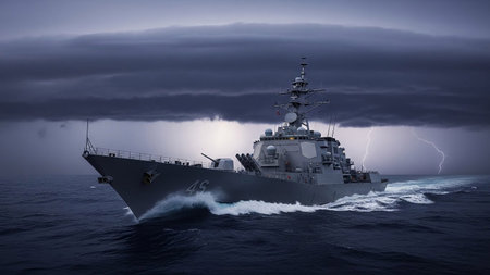 A powerful US Navy warship cuts through rough, dark ocean waters under a dramatic, stormy sky. Lightning strikes illuminate the scene, casting an intense glow on the vessel and the turbulent waves. The ship is depicted in motion, with water splashing around its hull, conveying a sense of power, speed, and the harsh realities of maritime operations in challenging weather conditions.