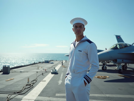 A sailor stands confidently on the deck of an aircraft carrier, showcasing military attire against a bright blue sky and ocean backdrop.