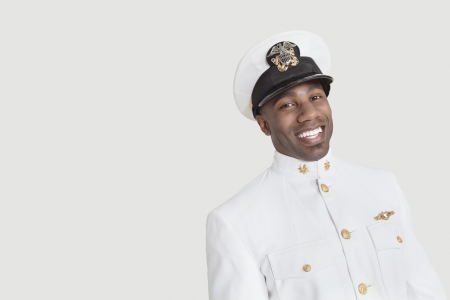 Confident naval officer in formal uniform with medals and cap against blue background.