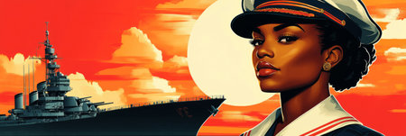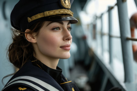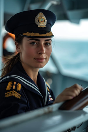A young female Navy officer in uniform, confidently navigating a ship, representing strength and diversity in the military.