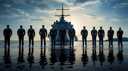 Marine crew members standing in a row on the deck of a cruise ship. Luxury yachting. Generative AI