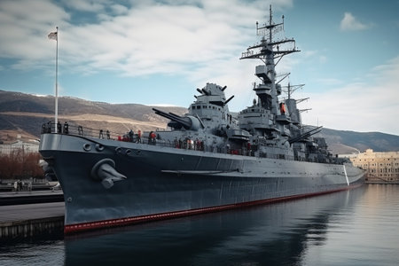Panoramic view of a naval battleship at sea, with its imposing structure cutting through the waves on a clear, sunny day.